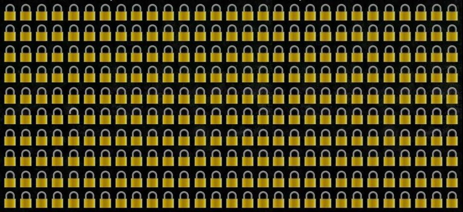 На изображении вы видите много желтых навесных замков. Все они кажутся на первый взгляд одинаковыми, во всех 29 столбцах и 10 рядах.