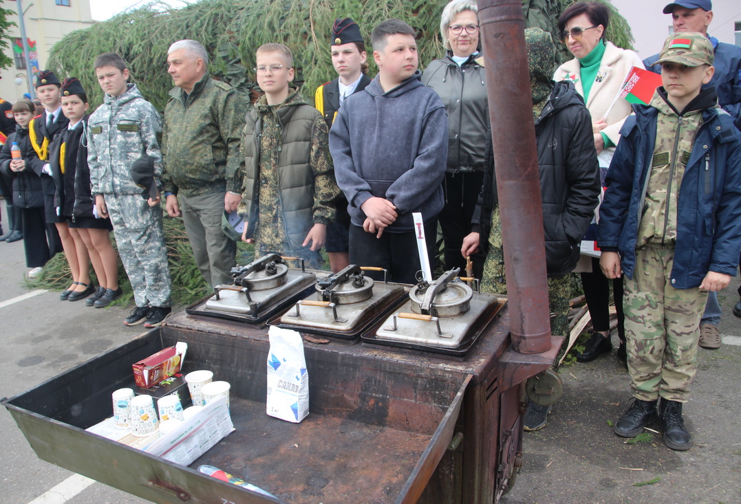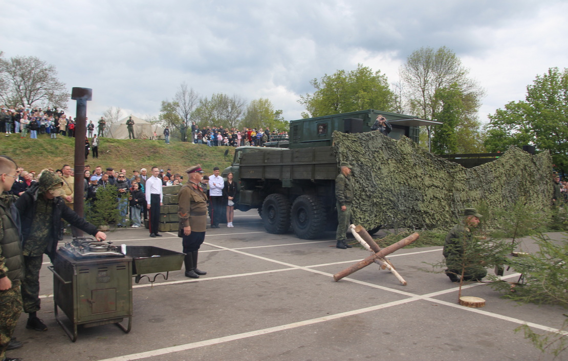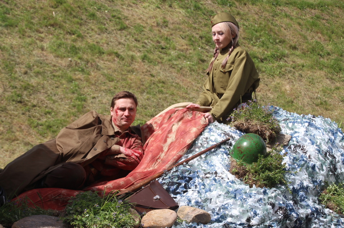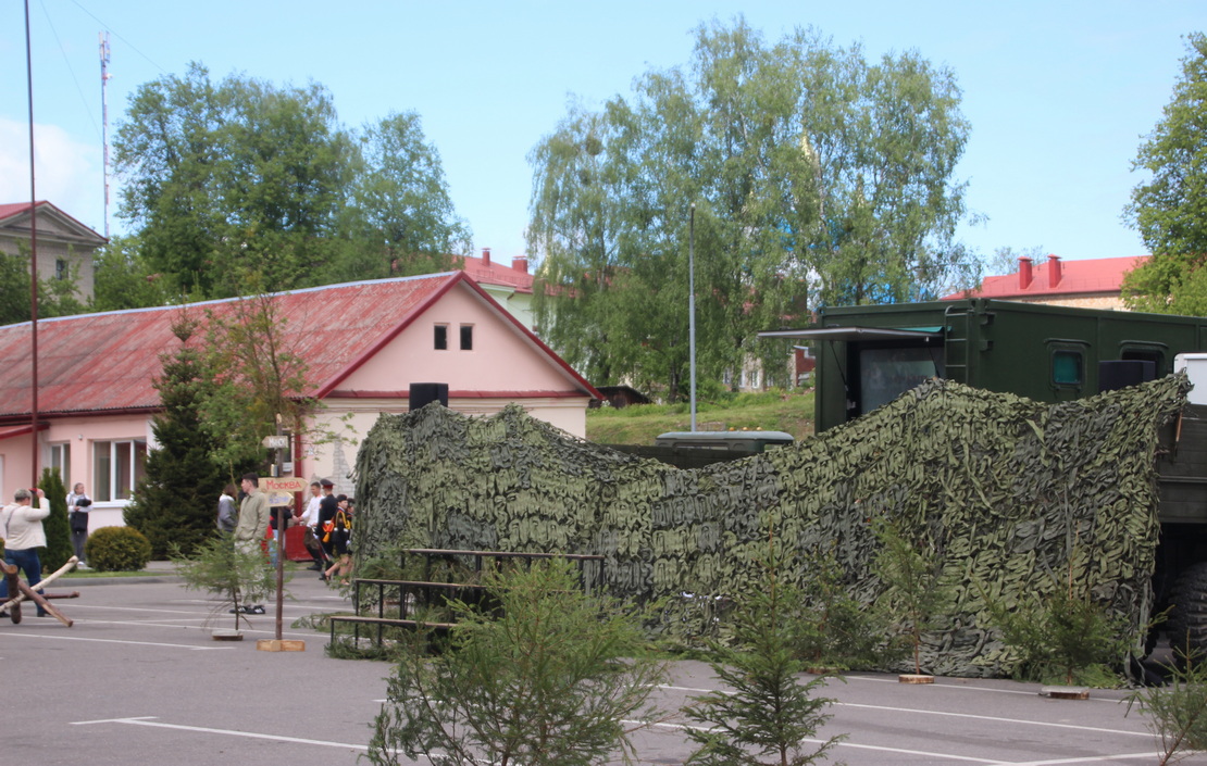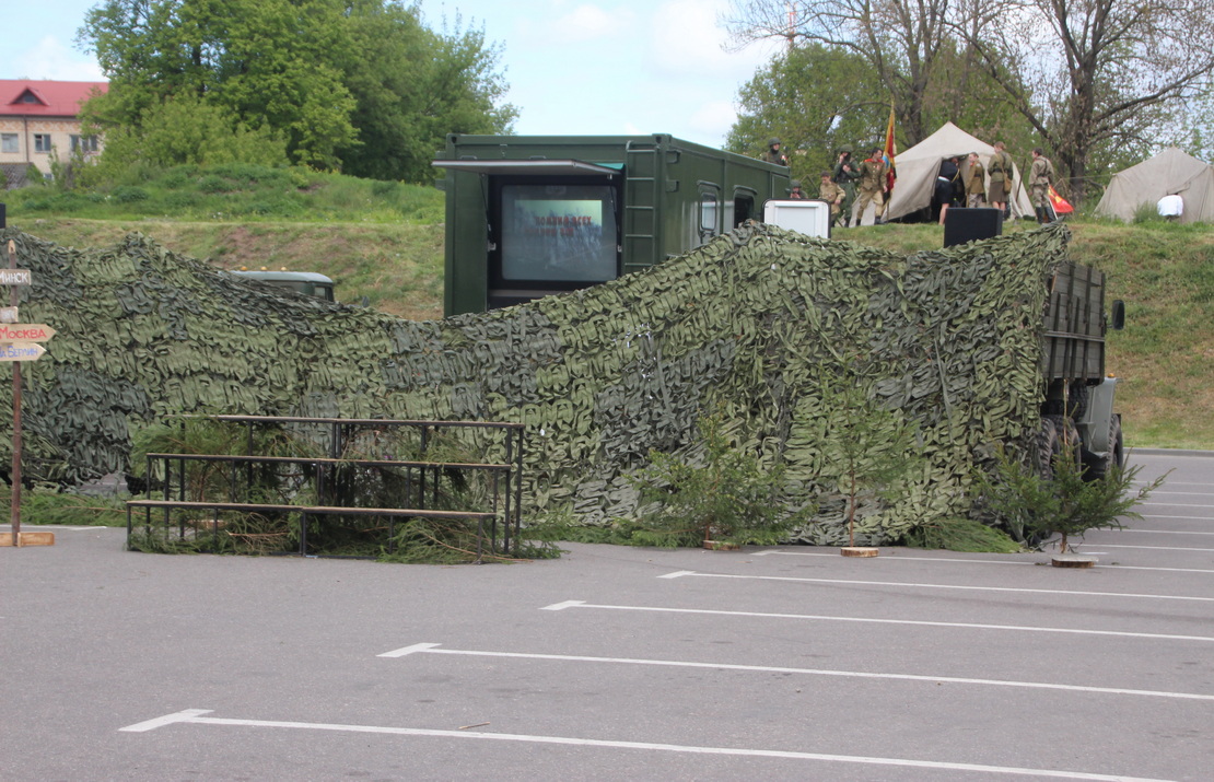На площадке были установлены армейские палатки, техника военных времён, полевая кухня, противотанковые заграждения. Камуфляжные сети, хвойные ветви, таблички с указателями «Минск», «Ленинград», «На Берлин» — всё это воссоздавало атмосферу передовой.