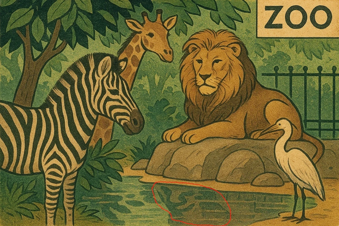 На первый взгляд — обычная сцена из зоопарка: зебра, лев, жираф и цапля у пруда. Но на этой винтажной иллюстрации скрыта загадка.