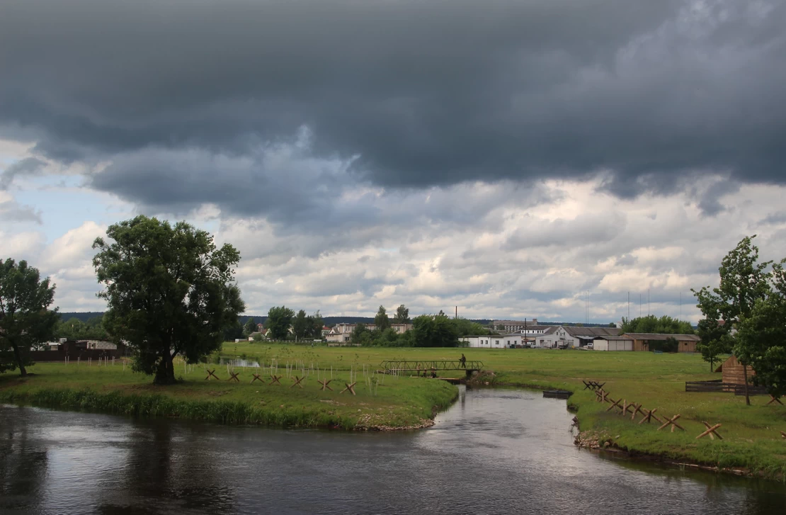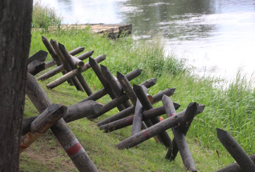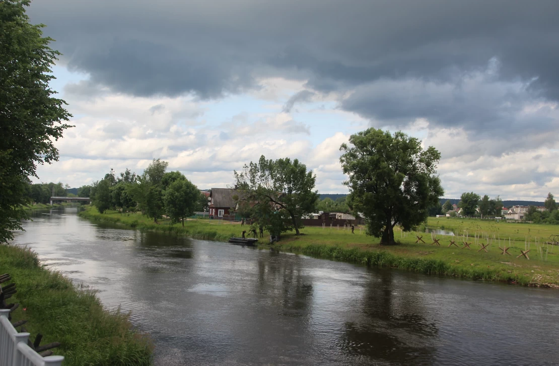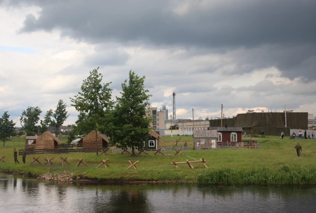 На берегу реки Щара выстроены доты, укрепления, имитирующие линию обороны. Под мостом установлены маскировочные конструкции, а на прибрежной полосе появились сторожевые будки, колючая проволока, мешки с песком и наблюдательные точки.