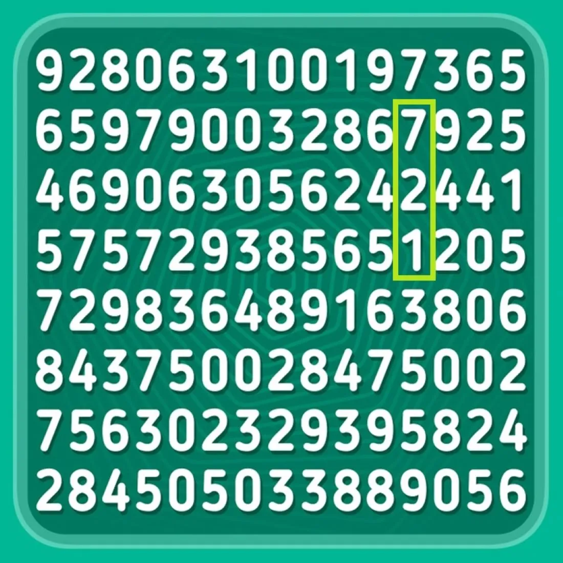 - Разделите задание на этапы: ищите сначала цифру 7, потом 2, затем 1. Представляйте себе комбинацию цифр как слово, которое нужно найти.