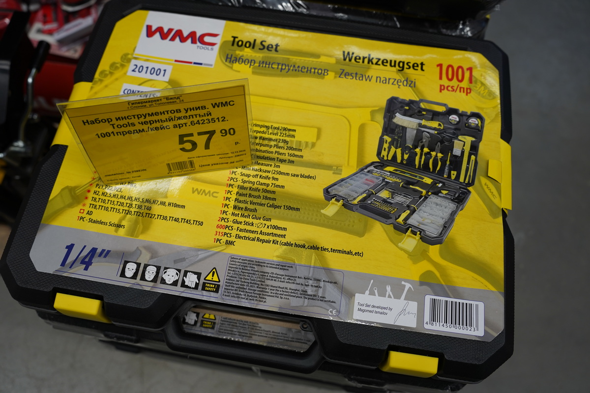 Практичные подарки тоже никто не отменял. В магазине можно выбрать электроинструменты, например дрели с насадками — по ценам 57 и 94 рубля, а также наборы для мойки автомобиля.