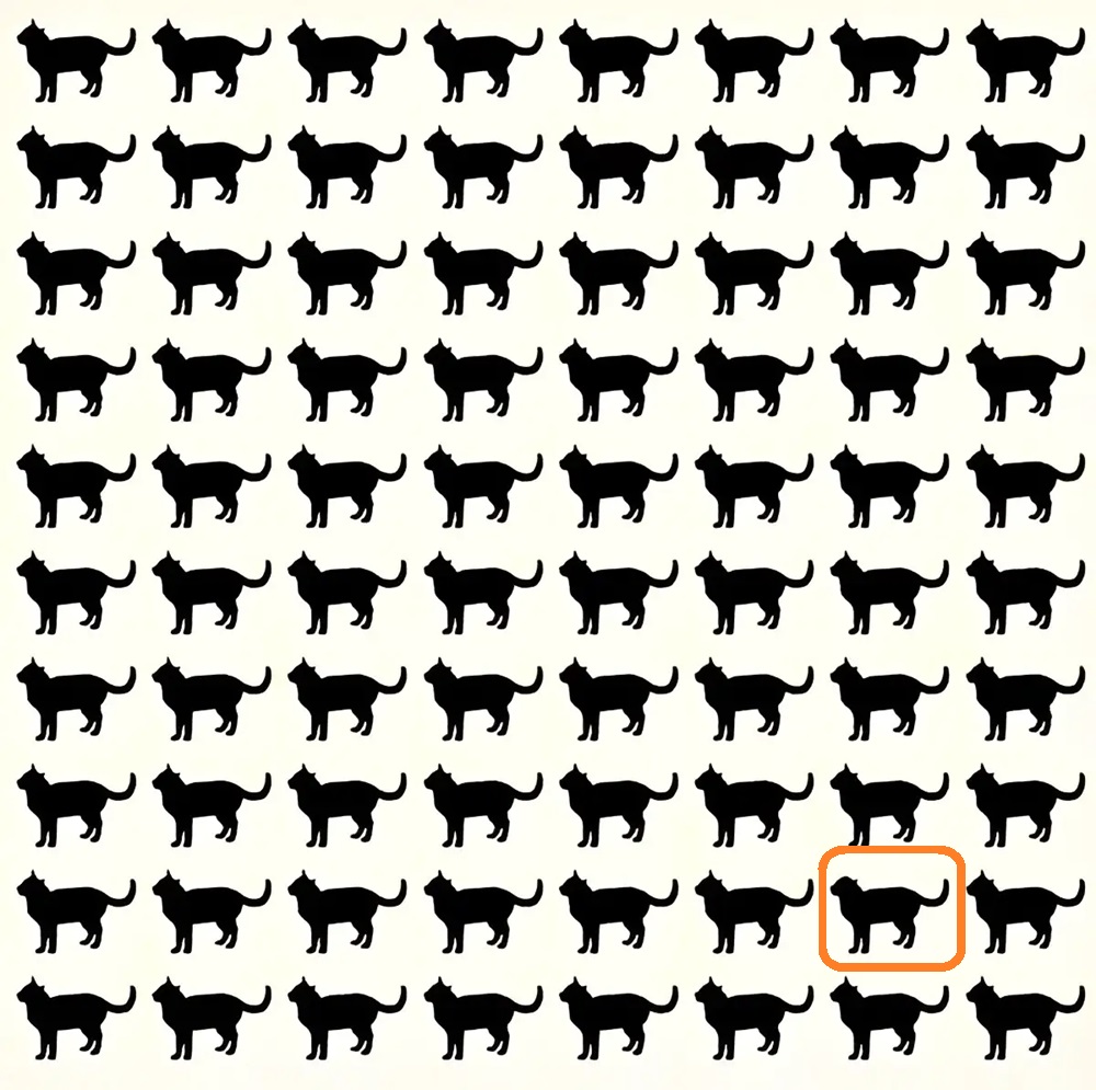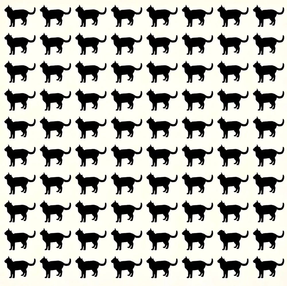 Итак, перед вами 80 черных кошек. Все они на первый взгляд похожи до мельчайших деталей. Однако среди этих одинаковых кошек спрялась одна кошка, которая отличается от всех остальных. Это различие едва заметно.