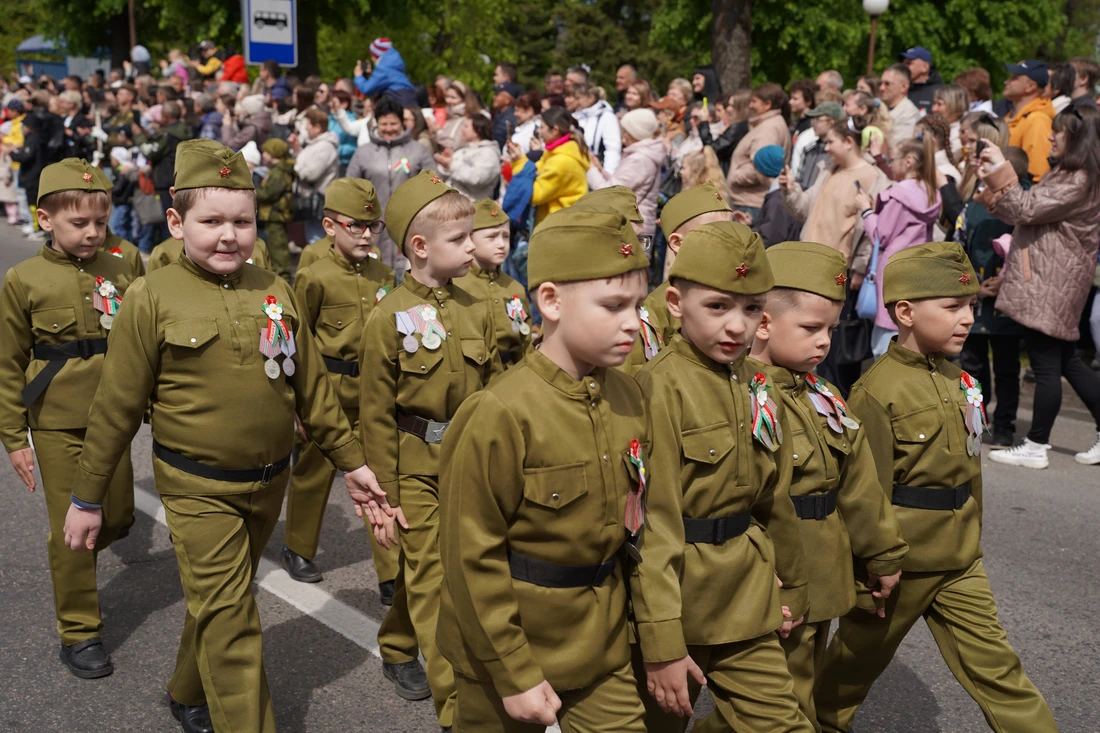 На улицах — автоколонны, инсталляции с кадрами из фильмов военной тематики, выставки и реконструкции. В Городском парке продолжается праздничное народное гуляние, работают интерактивные площадки, выставки вооружения, солдатская кухня, звучит живая музыка и песни Победы.