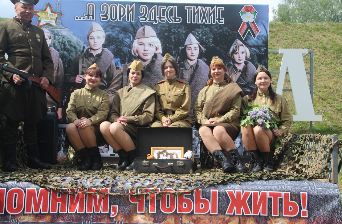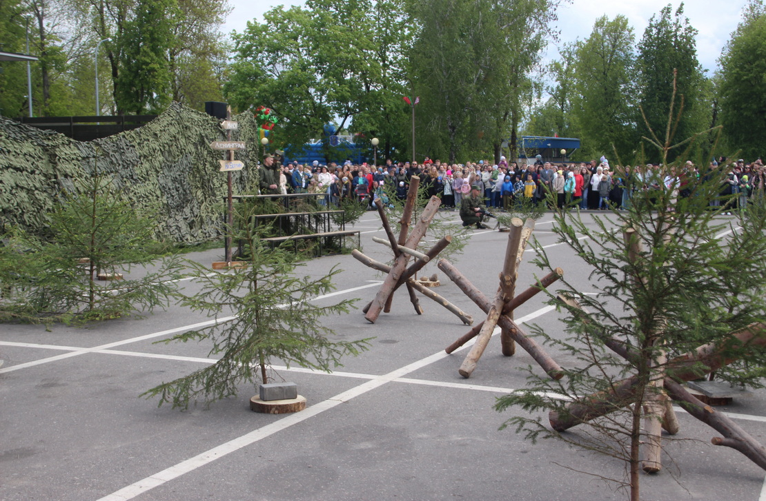 На площадке были установлены армейские палатки, техника военных времён, полевая кухня, противотанковые заграждения. Камуфляжные сети, хвойные ветви, таблички с указателями «Минск», «Ленинград», «На Берлин» — всё это воссоздавало атмосферу передовой.