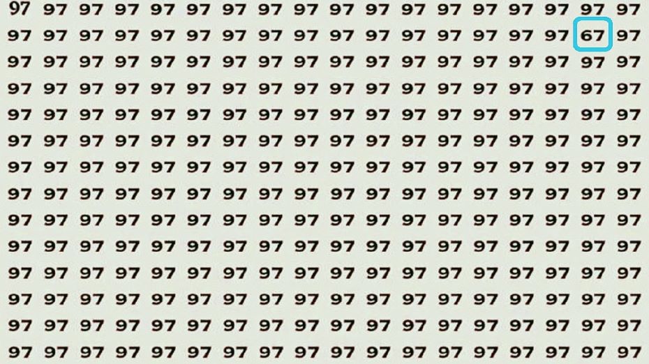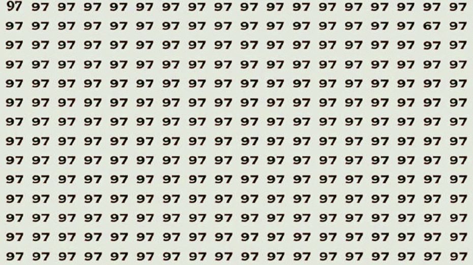 Предлагаем читателям визуальный вызов. Перед вами изображение большого поля, заполненного числом 97. Эти числа расположены в аккуратных 10 столбцах и 14 строках. Всё выглядит спокойно и привычно — ничего особенного, кроме одной маленькой детали… Среди всех этих одинаковых цифр скрывается одна отличающаяся от остальных!