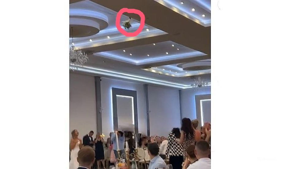 Букет взлетел высоко вверх и завис прямо над головами гостей, зацепившись за одну из декоративных балок потолка. Девушки недоуменно переглянулись и засмеялись, понимая, что этот раз традиционный ритуал закончился совсем иначе, чем ожидалось.