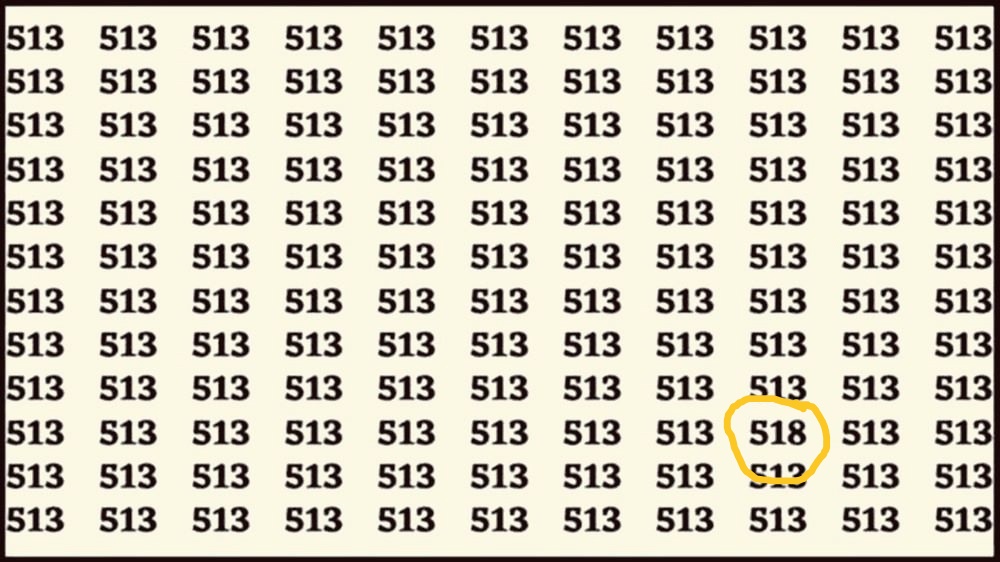 Среди множества одинаковых чисел 513 спрятано особое число — 518. Вы сможете найти его за 13 секунд?