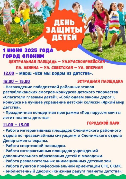 1 июня 2025 года в Слониме пройдёт яркое и насыщенное мероприятие, приуроченное ко Дню защиты детей. Праздничные события развернутся сразу на нескольких площадках города, сообщает ПУЛ Слонимский.