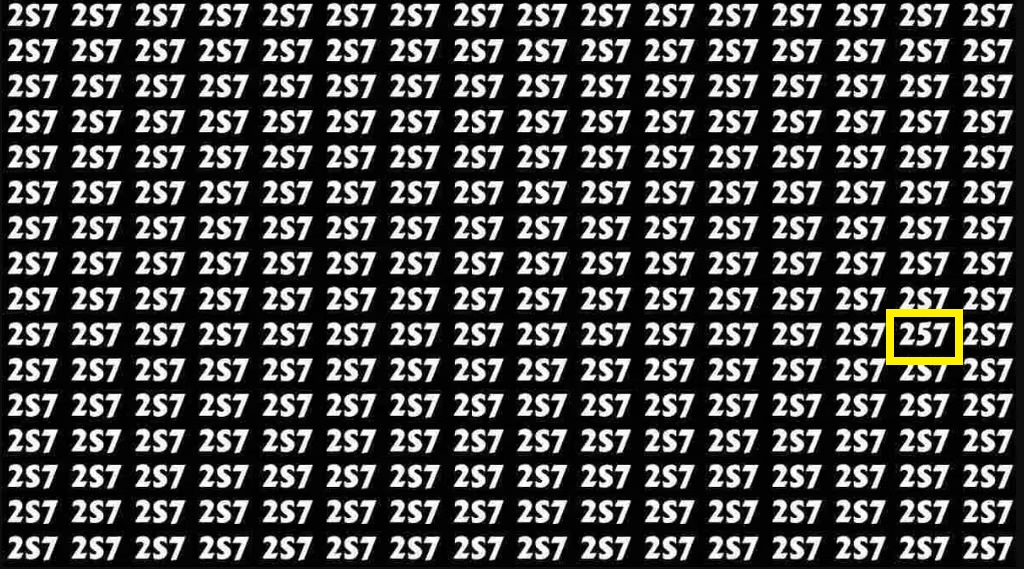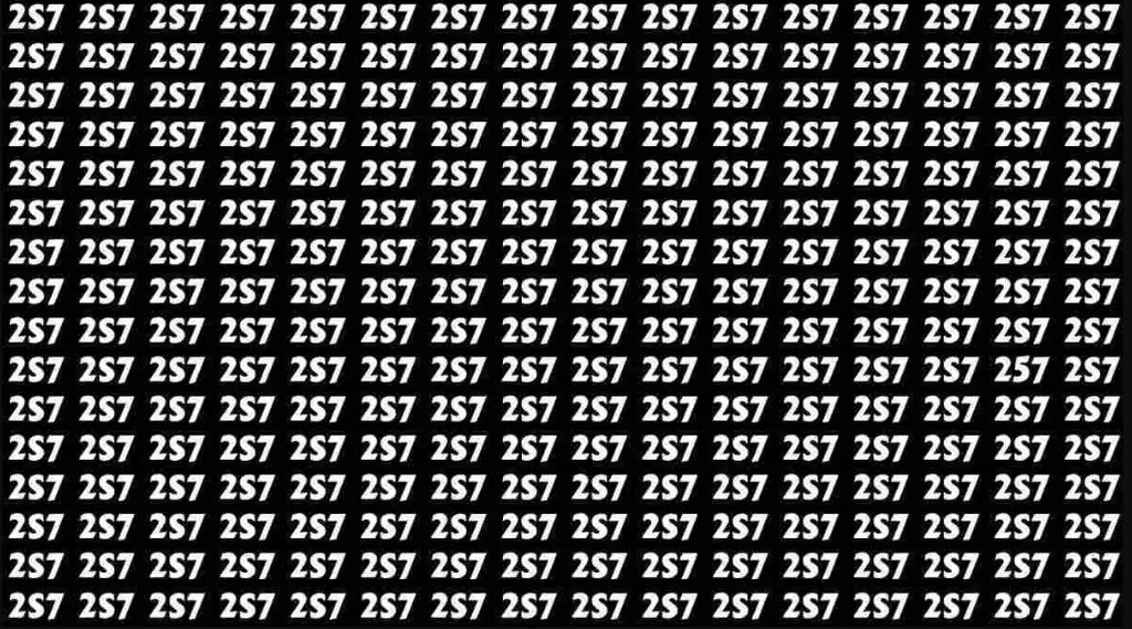 Перед вами изображение, заполненное множеством элементов, похожих на искомый объект — смесью букв и цифр «2S7». Ваша задача — обнаружить единственную последовательность чисел «257». Обратите внимание, что правильный вариант состоит исключительно из цифр, тогда как остальные элементы содержат буквы («2S7»).
