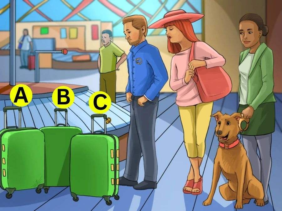 Путешественников трое — мы видим мужчину в синей рубашке, женщину в розовой шляпе и с такой же сумкой и еще одну женщину в зеленом пиджаке, которая держит на поводке собаку. Каждый из путешественников собирается забрать свой чемодан. Но кому какой чемодан принадлежит? На первый взгляд кажется, что связь неочевидна.