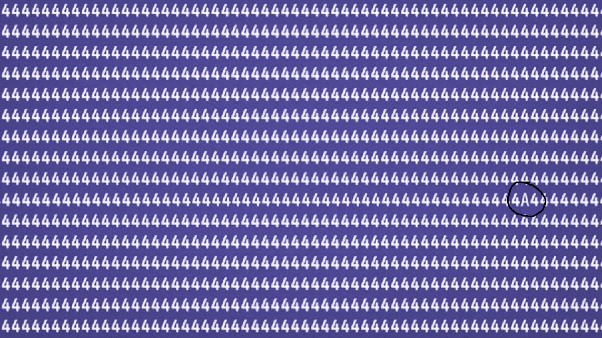 Перед вами сложная картинка, наполненная множеством мелких элементов в виде цифр 4. Ваша задача — обнаружить единственную букву «А», спрятавшуюся среди множества отвлекающих деталей. И всё это — всего за 10 секунд!