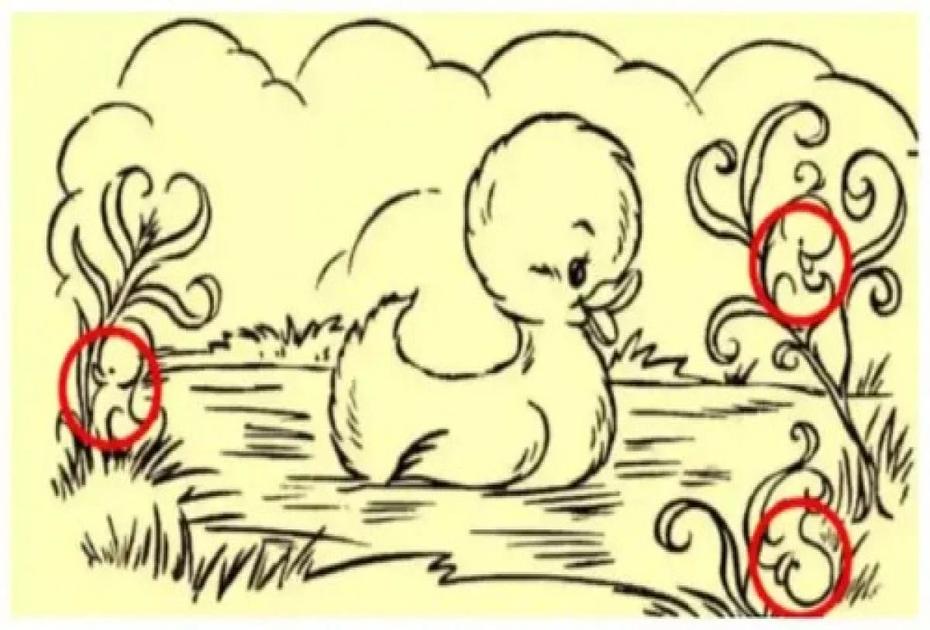 Перед вами простая на первый взгляд картинка: утка-мама отдыхает в пруду. Но где её утята? Маленькие хитрецы спрятались так ловко, что найти их удается только самым внимательным. У вас есть всего 7 секунд — справитесь?