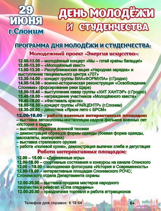 В воскресенье , 29 июня, Слоним отметит День молодёжи и студенчества. С полудня и до позднего вечера горожан и гостей ждут концерты, квесты, военно-историческое шоу, ярмарка ремёсел и масштабная дискотека, сообщает ПУЛ Слонимский.
