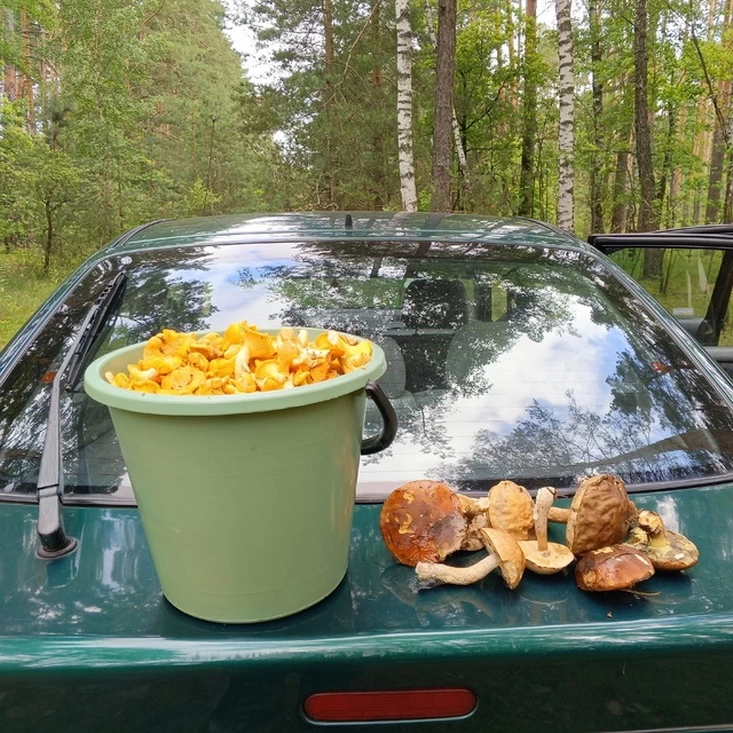 Вадим Корчавец тоже доволен: его багажник заполнен грибами до краёв. По словам грибника, особенно много лисичек и подосиновиков, и он планирует вернуться в лес ещё раз в тот же день.