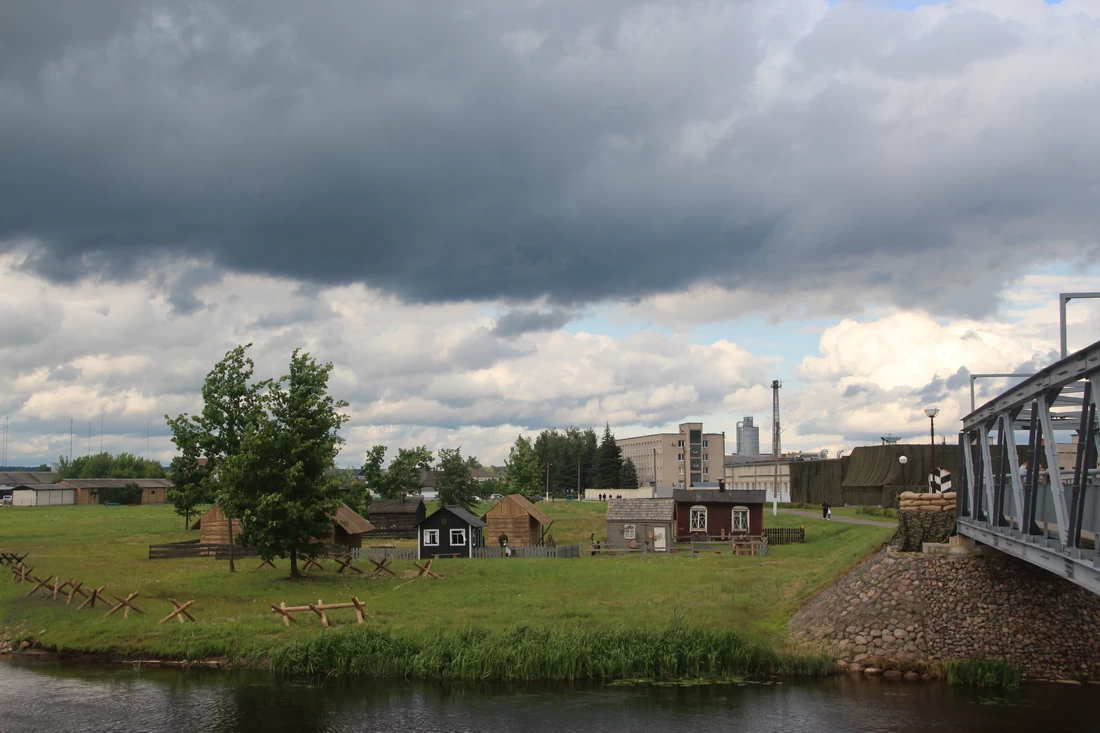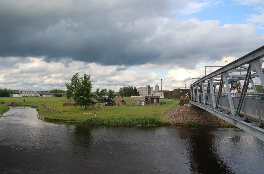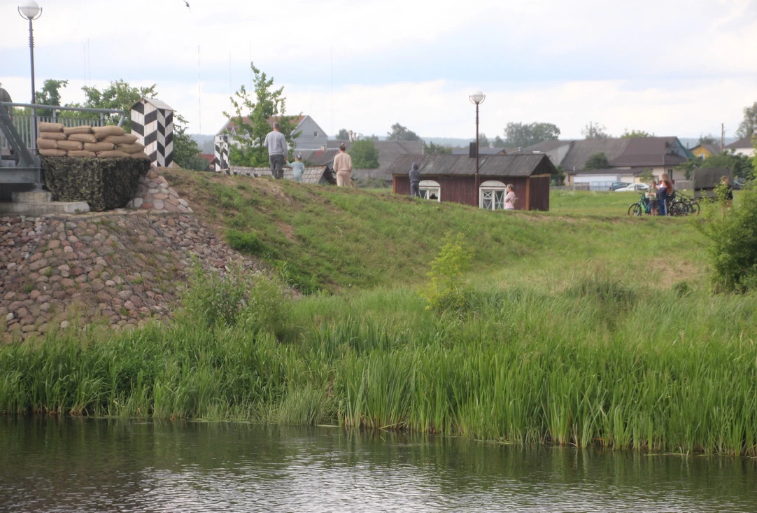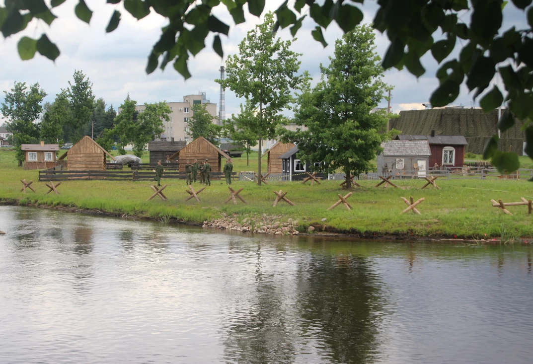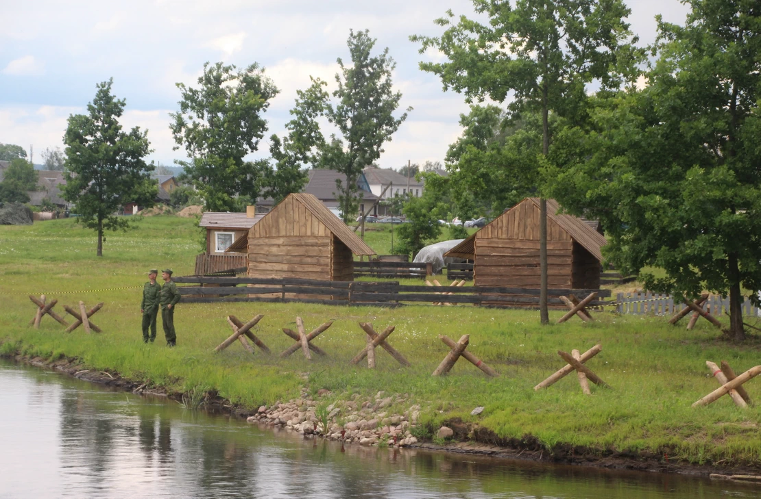 На берегу реки Щара выстроены доты, укрепления, имитирующие линию обороны. Под мостом установлены маскировочные конструкции, а на прибрежной полосе появились сторожевые будки, колючая проволока, мешки с песком и наблюдательные точки.