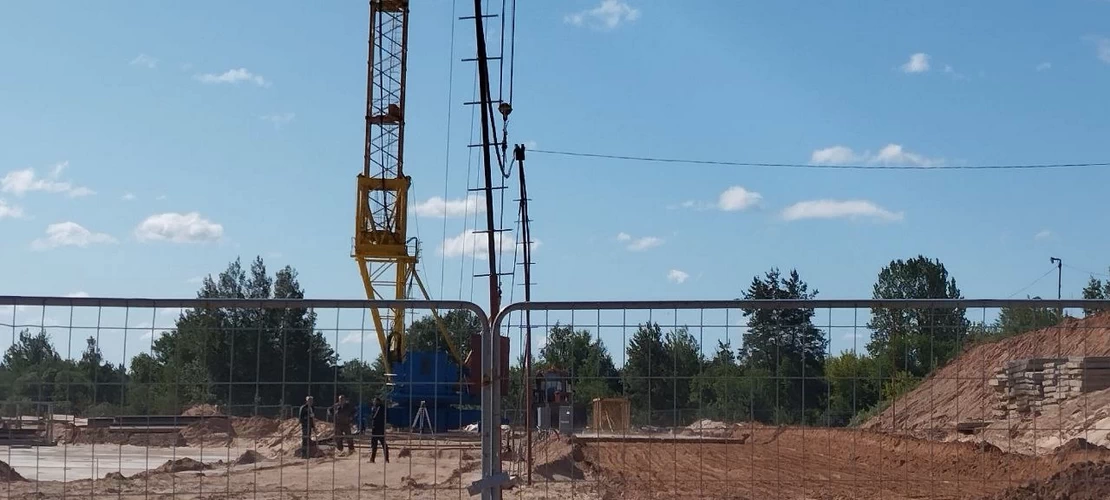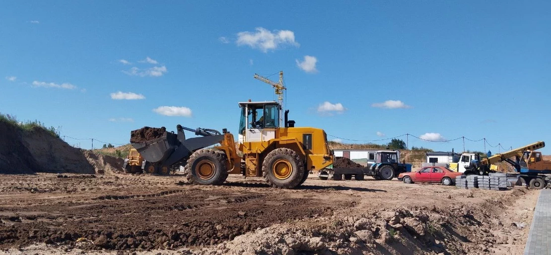 На объекте задействовано много спецтехники. Дорога проходит вблизи участка, где планируется строительство нового многоэтажного жилого дома.