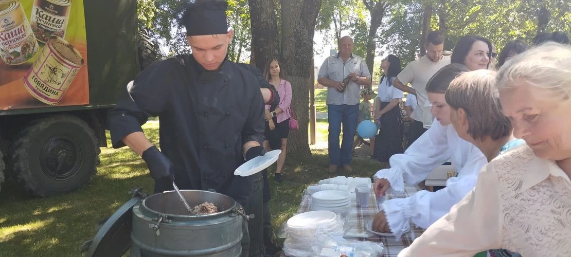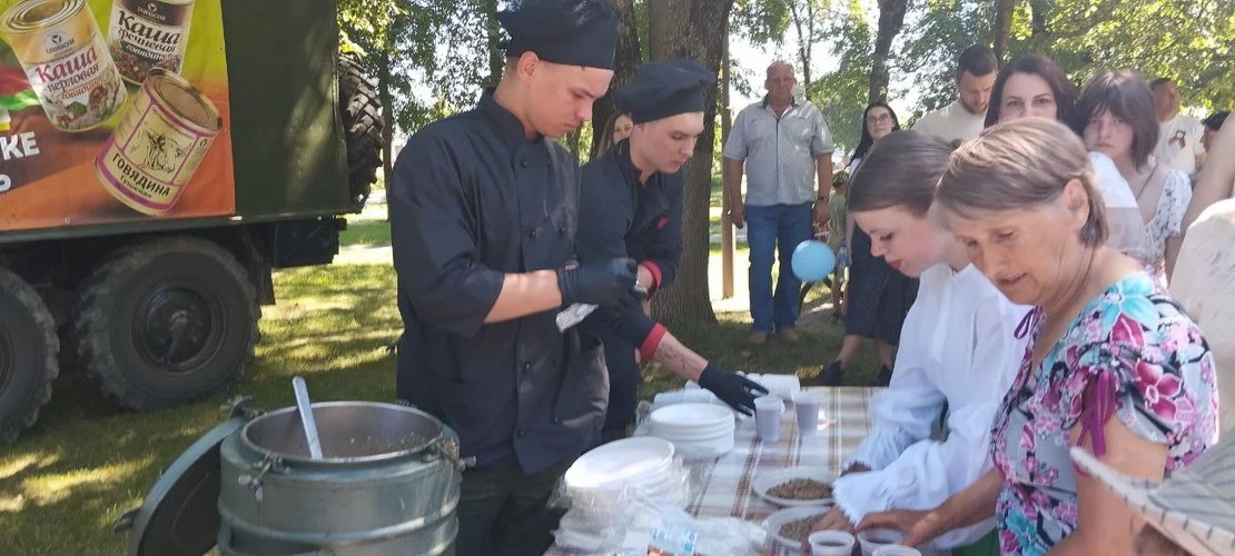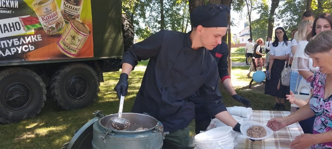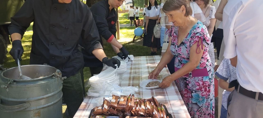Настоящим гастрономическим событием стала полевая кухня: повара 11-й гвардейской механизированной бригады угощали гречневой кашей с тушёнкой, вафлями и горячим сладким чаем. Очередь за солдатской кашей выстроилась внушительная.