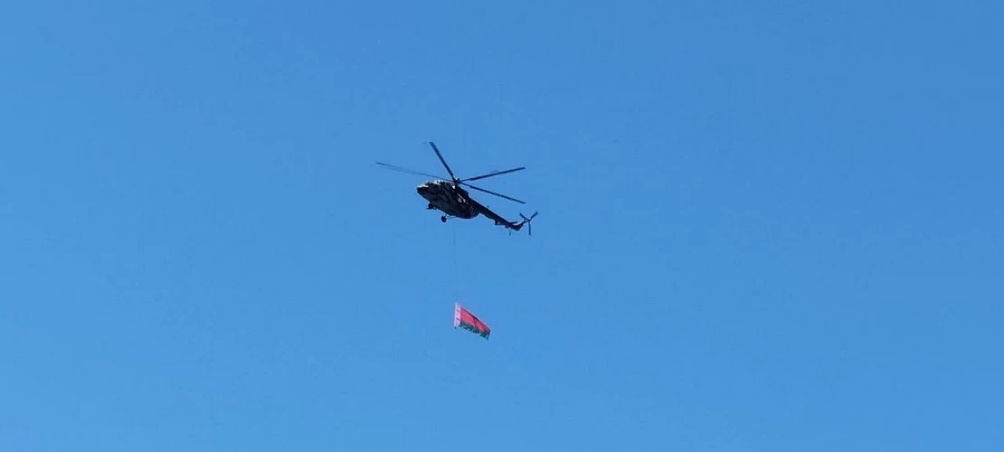 Над Слонимом кружит вертолёт с Государственным флагом в честь Дня Независимости