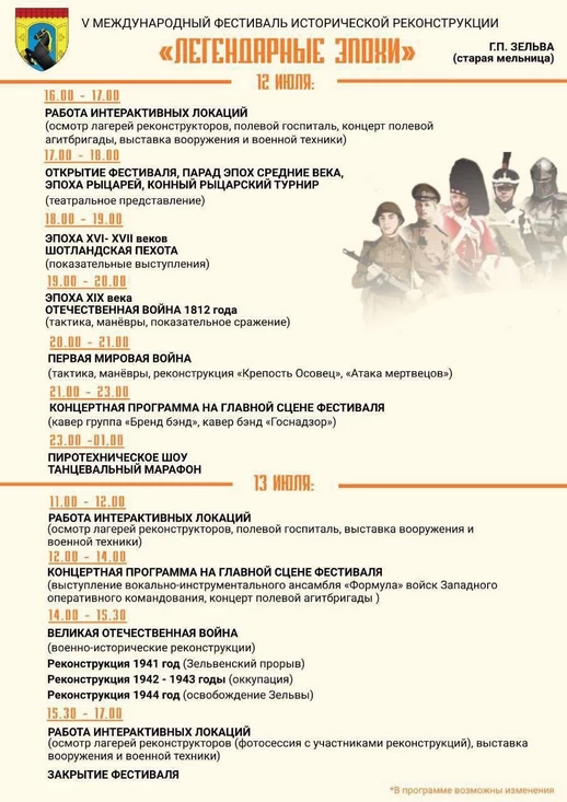 12 и 13 июля у старой мельницы в городском посёлке Зельва состоится V Международный фестиваль исторической реконструкции «Легендарные эпохи». Это яркое событие, посвящённое военной истории разных столетий, обещает зрителям насыщенную программу, зрелищные постановки и живое погружение в прошлое, сообщает газета «Праца».