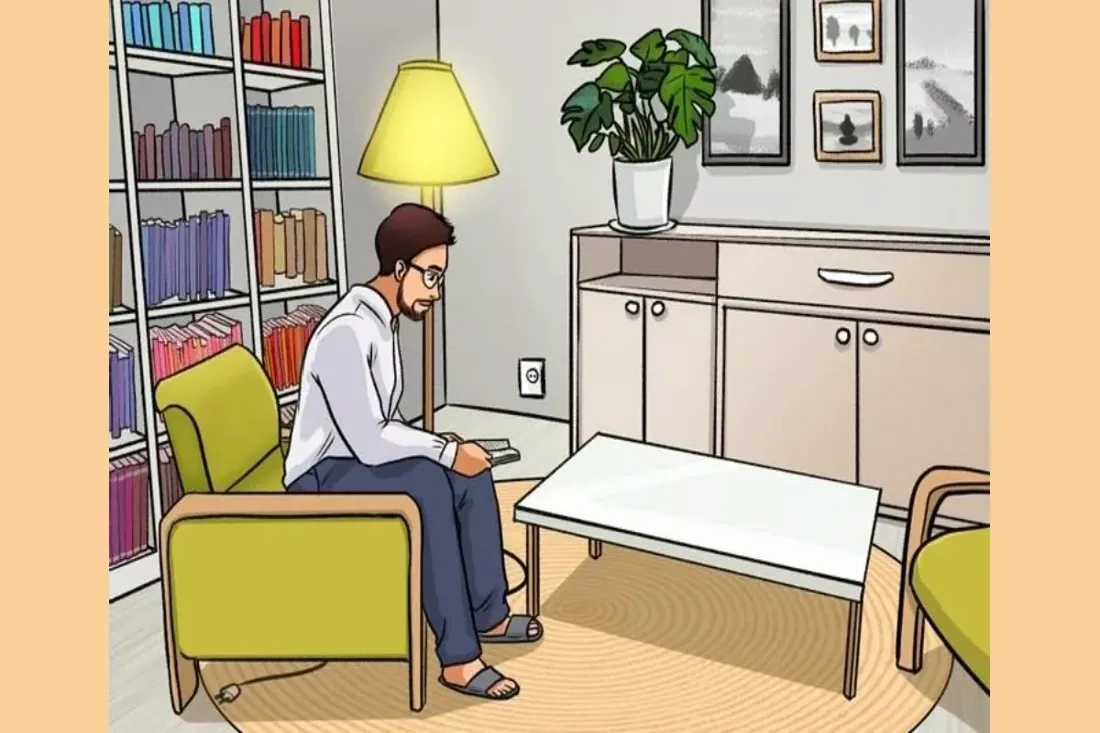 Правильный ответ: лампа горит, хотя вилка от её провода… валяется под креслом, не подключённая к розетке. Такое в реальности невозможно — и в этом весь подвох.