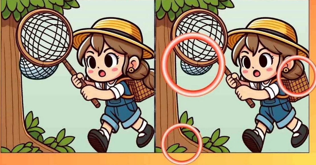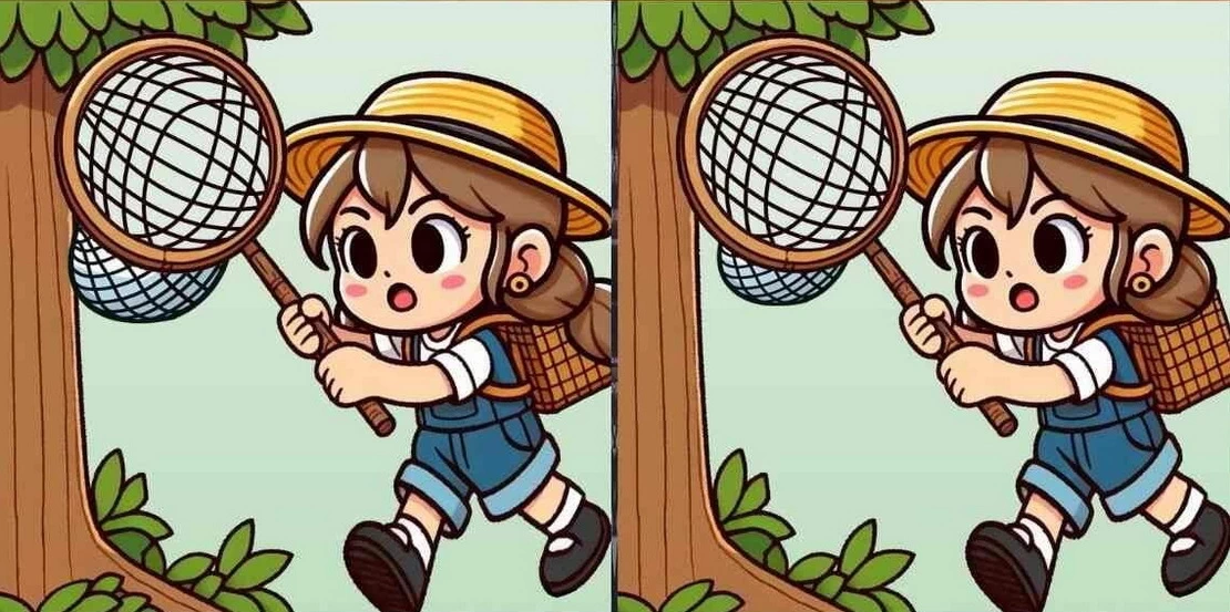 На первый взгляд кажется, что перед вами две абсолютно одинаковые картинки с девочкой, ловящей бабочек. Но не спешите: здесь спрятаны три тонких отличия.
