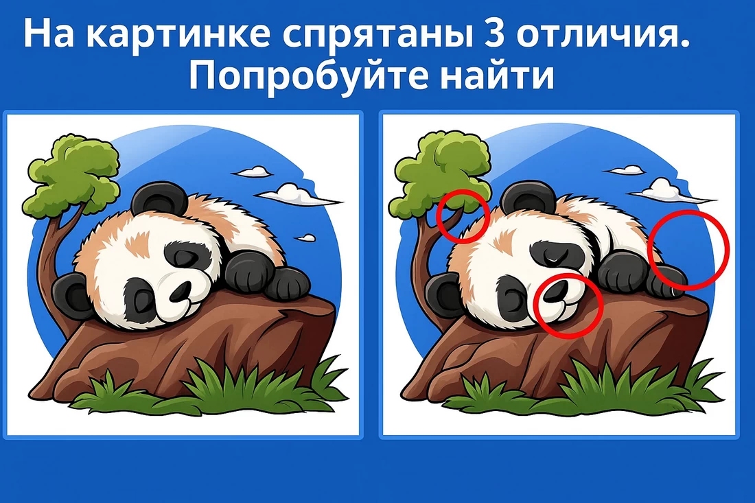 Перед вами две одинаковые панды, мирно спящие на камнях. Но не все так просто: между ними спрятались три отличия. Кажется, ерунда? Попробуйте отыскать их за 21 секунду, и убедитесь, насколько это непросто.