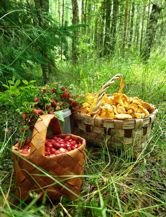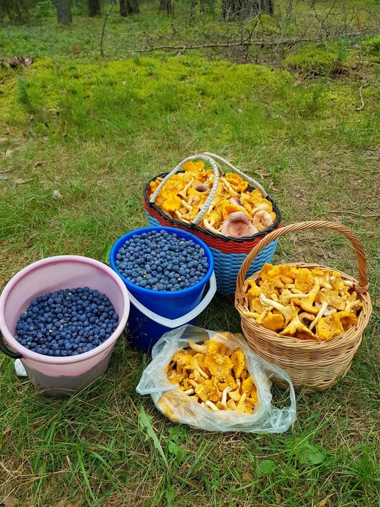 В корзинах не только лисички, подберёзовики и белые, но и малина, черника, земляника и голубика. Хотя голубики, как отмечают многие, в этом году заметно меньше, чем в прошлом: если раньше удавалось собрать по пять вёдер, то сейчас — едва ли два.