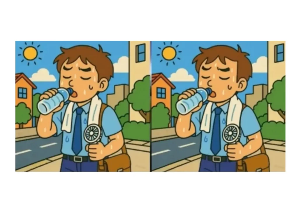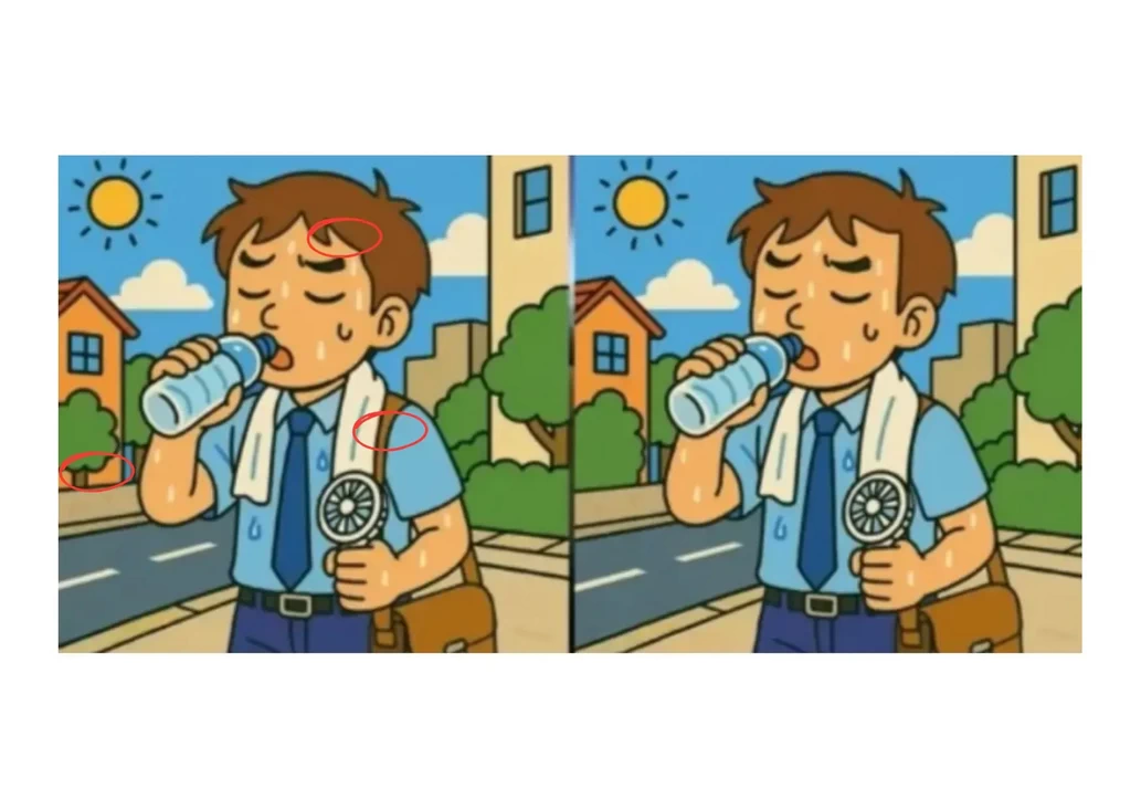 Перед вами — два почти идентичных изображения. На них мужчина изнывает от жары: он пьёт воду, держит полотенце и обмахивается вентилятором.