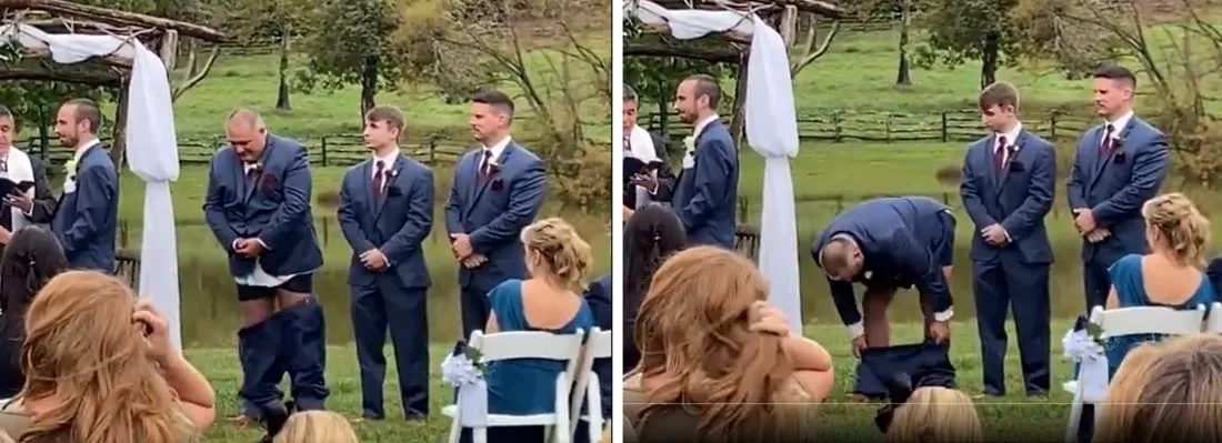 Видео ясно показывает, как в решающий момент церемонии, когда гости внимательно следили за молодожёнами, брюки шафера неожиданно сползли прямо на пол, вызвав сначала изумление, а потом искренний восторг собравшихся.