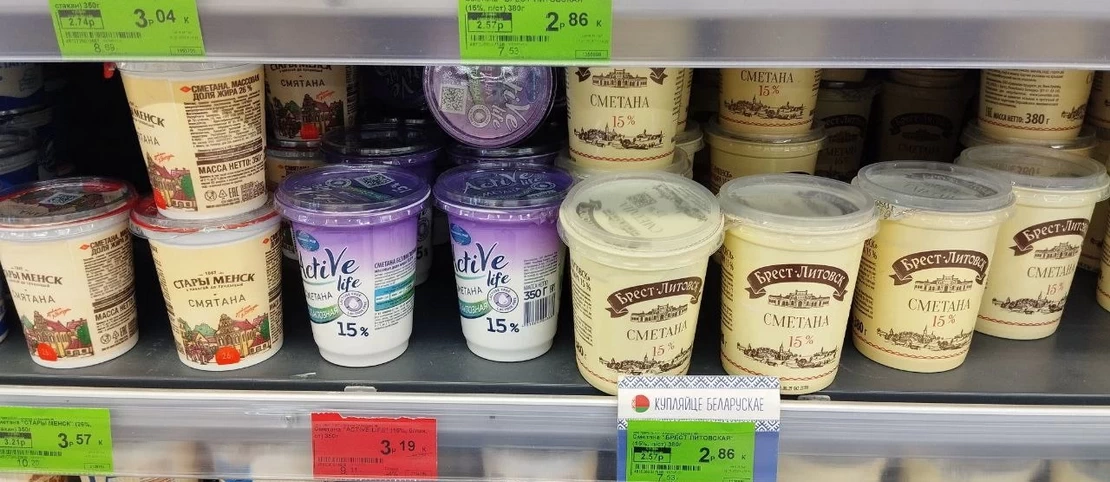 Сметана в Слониме представлена в большом ассортименте: жирность от 15% до 26%, масса упаковок — от 350 до 400 г.