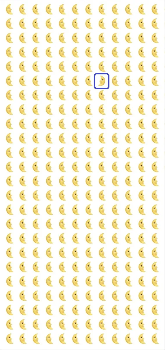 Перед вами рисунок, заполненный десятками мелких изображений луны, расположенных ровными рядами на чистом белом фоне. Внешне все они выглядят совершенно одинаковыми, но ваша цель — обнаружить единственную луна-трюкач, отличающуюся от всех остальных.