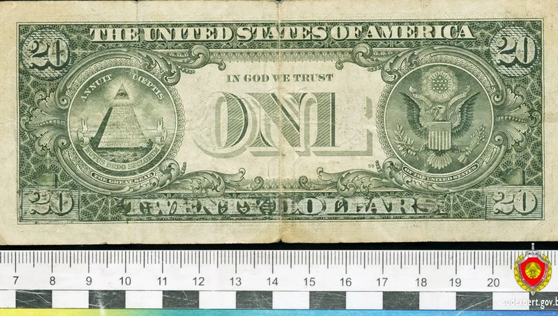При проведении исследования специалистами Барановичского межрайонного отдела Государственного комитета судебных экспертиз установлено, что денежный билет изготовлен предприятием, осуществляющим производство продукции данного вида. Вот только номинал банкноты иной – один доллар. Содержание денежного билета подвергалось техническим изменениям путем заклеивания первоначальных реквизитов, текстов фрагментами с изображением другого номинала. Применялась подчистка части штрихов букв.