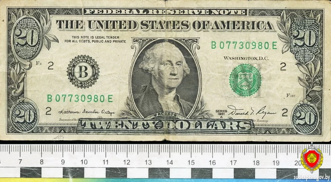 При проведении исследования специалистами Барановичского межрайонного отдела Государственного комитета судебных экспертиз установлено, что денежный билет изготовлен предприятием, осуществляющим производство продукции данного вида. Вот только номинал банкноты иной – один доллар. Содержание денежного билета подвергалось техническим изменениям путем заклеивания первоначальных реквизитов, текстов фрагментами с изображением другого номинала. Применялась подчистка части штрихов букв.