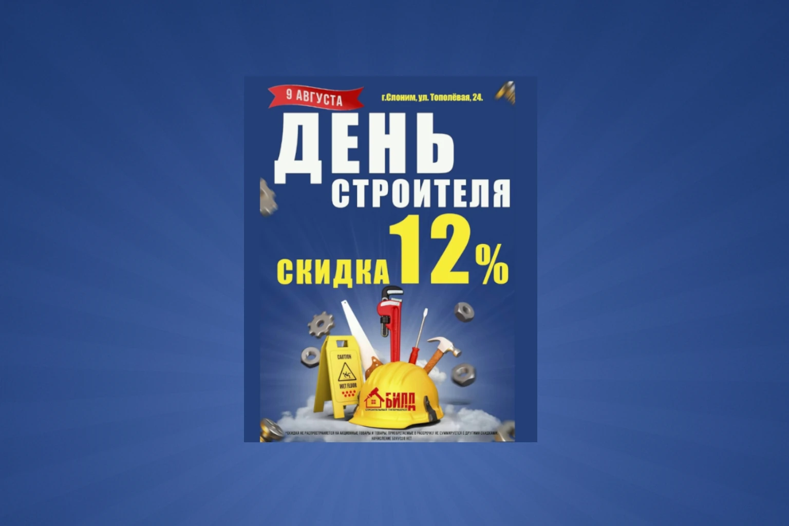 Гипермаркет БИЛД поздравляет всех с Днём Строителя и дарит СКИДКУ 12 на весь ассортимент.
