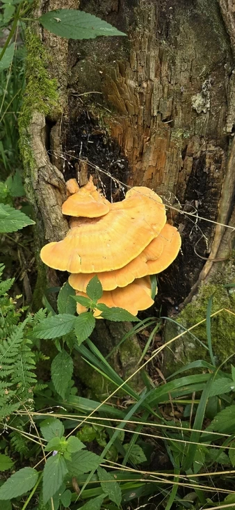 А Наталья Понякова обратила внимание на крупные оранжевые грибы на стволе дуба. Опытные грибники сразу узнали в них трутовик серно-жёлтый. В молодом возрасте он съедобен, а некоторые используют его в фарше — в смеси с мясом.
