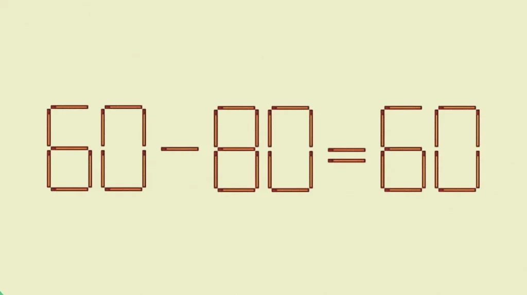 Перед вами уравнение, составленное из спичек: 60–80=60. Ваша задача — всего за 15 секунд переместить одну-единственную спичку так, чтобы неверное равенство превратилось в верное.