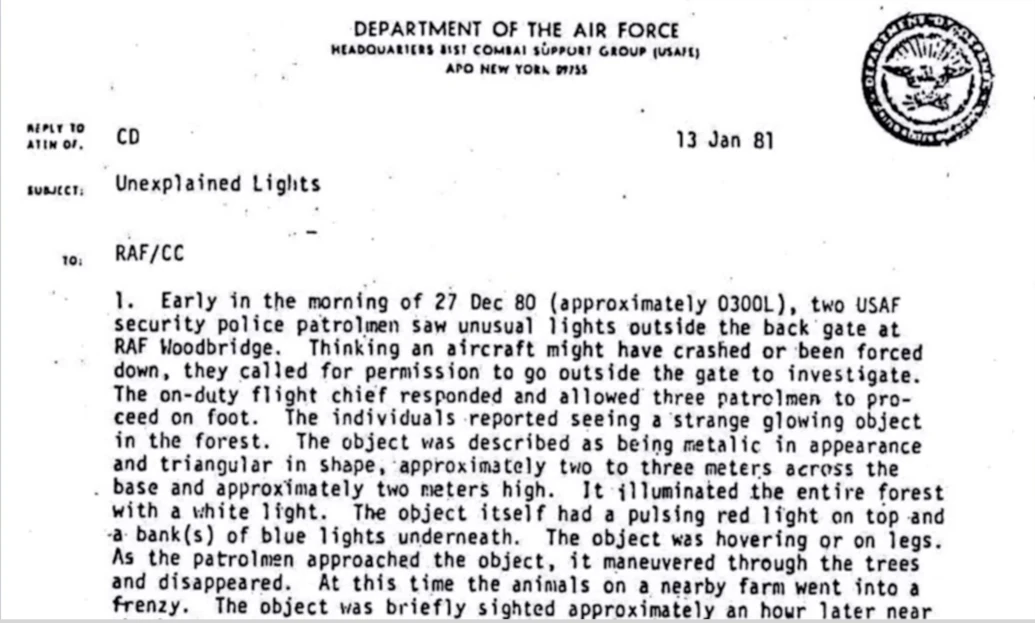 Подполковник Чарльз Холт — кадровый офицер с 20-летним стажем, безупречный послужной список, высший допуск секретности — лично возглавил расследование. Его официальный меморандум от 13 января 1981 года (рассекречен) описывает: треугольный металлический объект, пульсирующие огни, луч света, направленный в зону хранения оружия.