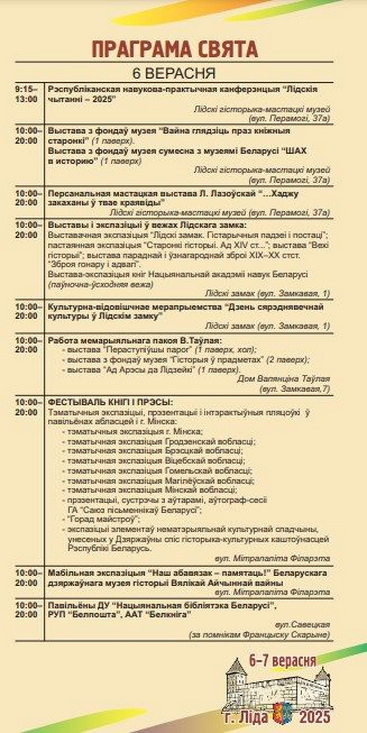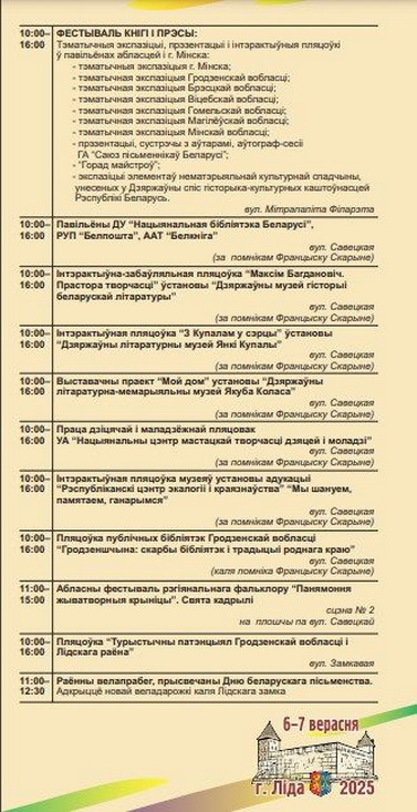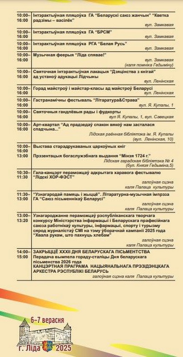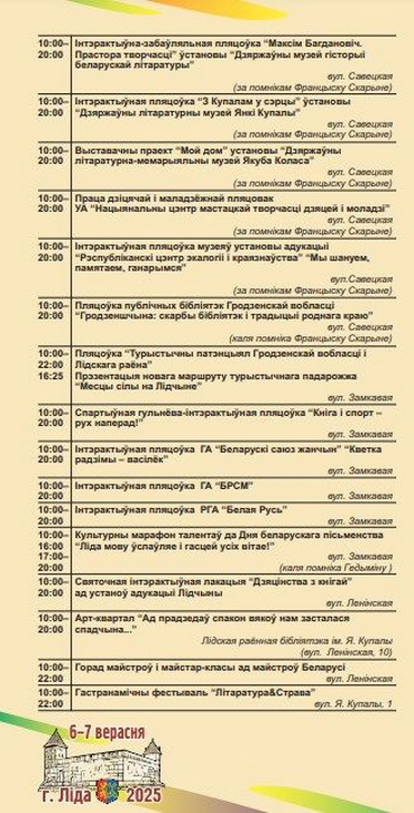 Центральным событием станет Фестиваль книги и прессы. На нём каждая область представит свой литературный потенциал и новые достижения в книгоиздании. В Лиду приедут региональные союзы писателей со своими делегациями, читатели смогут встретиться с авторами, задать вопросы и получить автографы.