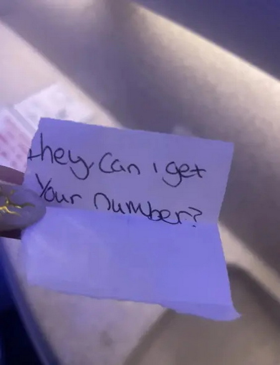 Женщина поделилась историей на Reddit, где её пост быстро набрал популярность. По её словам, она отлучилась в уборную, а вернувшись, нашла на сиденье записку с коротким текстом: «Привет, можно твой номер телефона?»