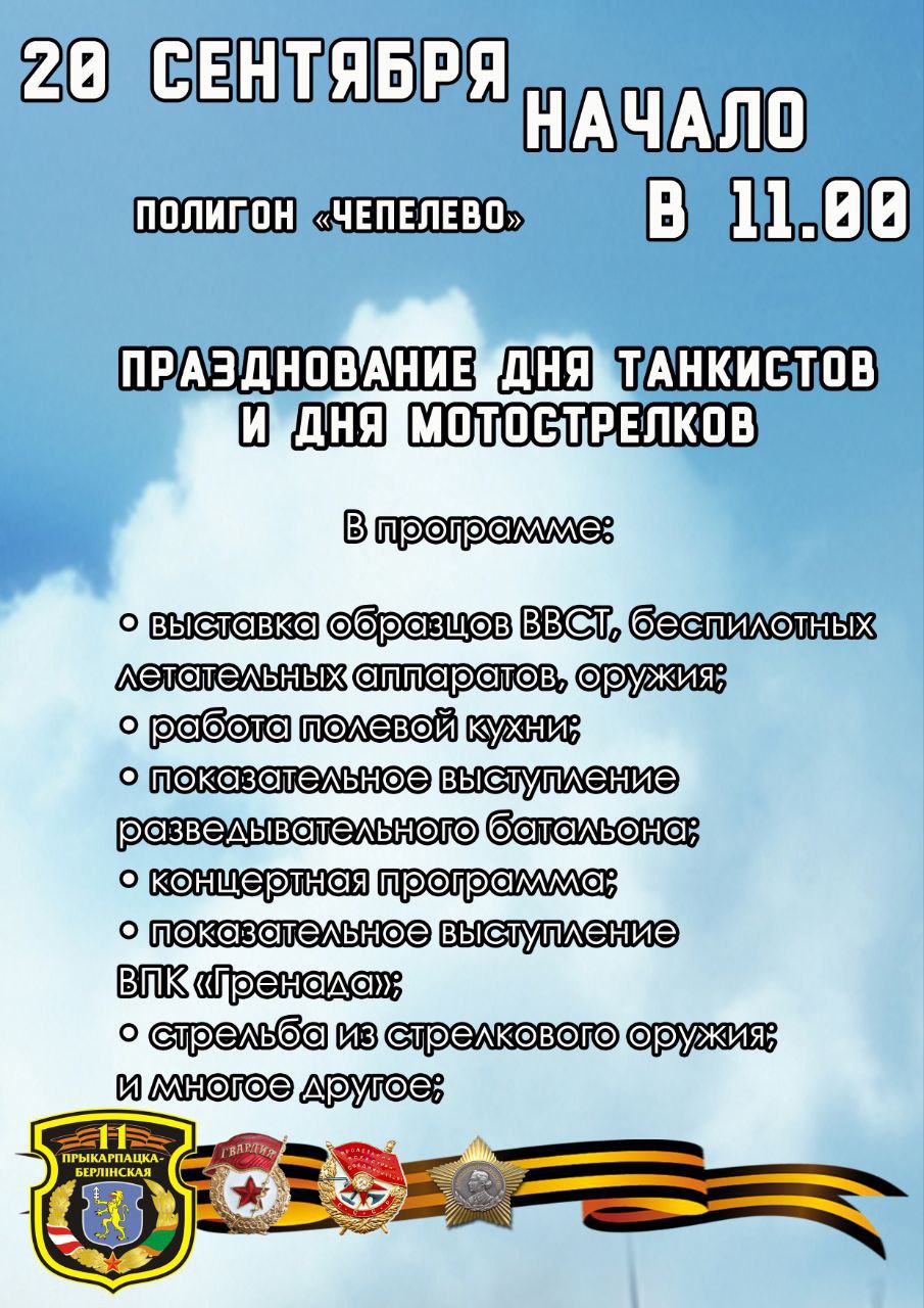 20 сентября на полигоне «Чепелево» пройдет праздничное мероприятие, посвященное Дню танкистов и Дню мотострелков. Начало — в 11:00, сообщает 11 омбр.