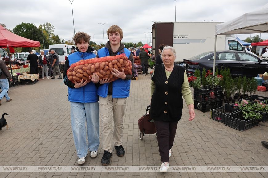 Среди желающих купить сеточку недорого картофеля — пенсионерка, проживающая в микрорайоне Чижовка. Собственноручно домой тяжелую покупку не доставить — на помощь пришли дежурившие на ярмарке студенты БГУ Никита и Николай, которые с радостью помогли бабушке.