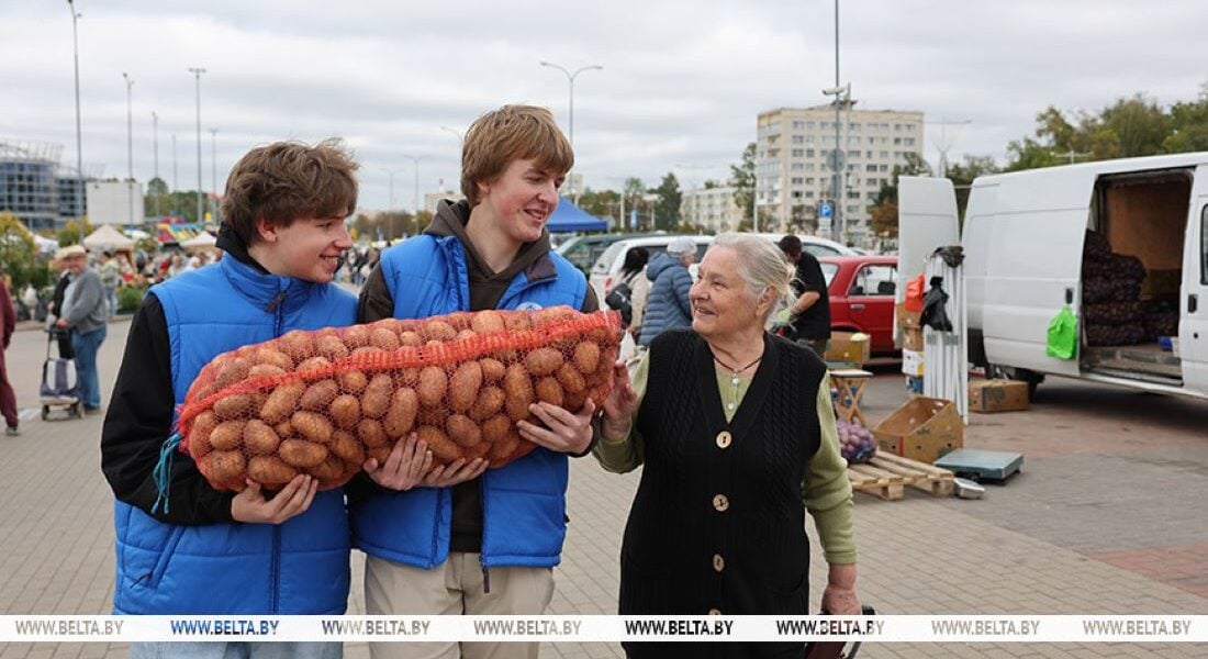 Среди желающих купить сеточку недорого картофеля — пенсионерка, проживающая в микрорайоне Чижовка. Собственноручно домой тяжелую покупку не доставить — на помощь пришли дежурившие на ярмарке студенты БГУ Никита и Николай, которые с радостью помогли бабушке.
