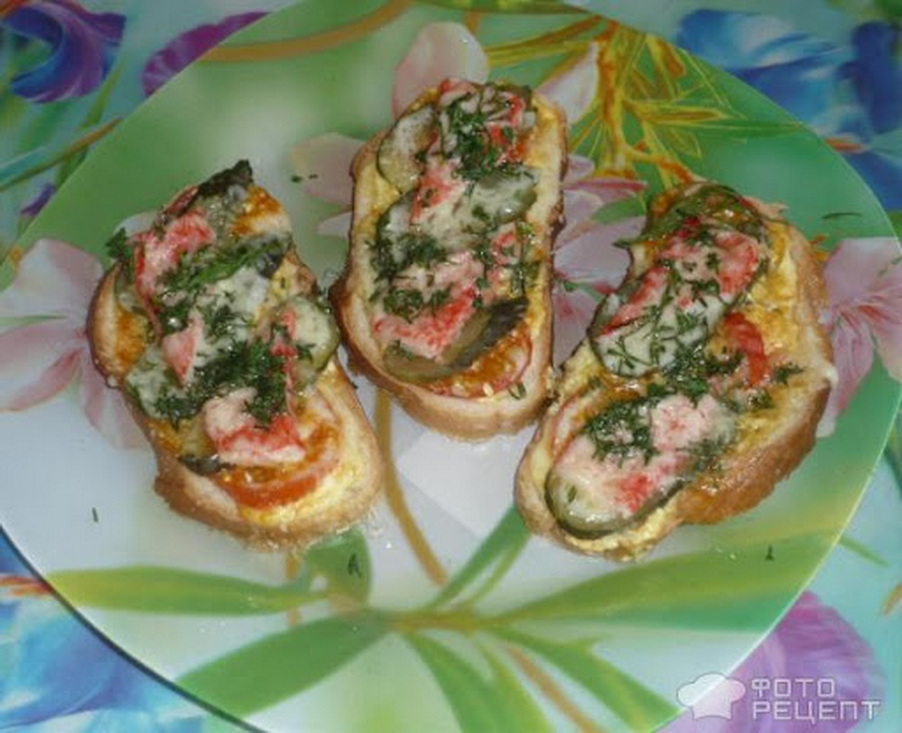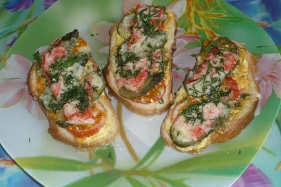 Хрустящий хлеб, сочные помидоры, нежные крабовые палочки и расплавленный сыр — всё, что нужно для аппетитного перекуса или лёгкого ужина.
