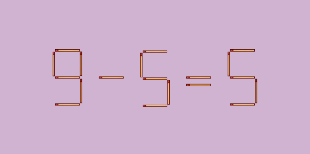 Дано уравнение: 9−5=5. Нужно передвинуть одну спичку из тех, которыми выложены цифры и знаки, на другое место таким образом, чтобы получилось правильное равенство.