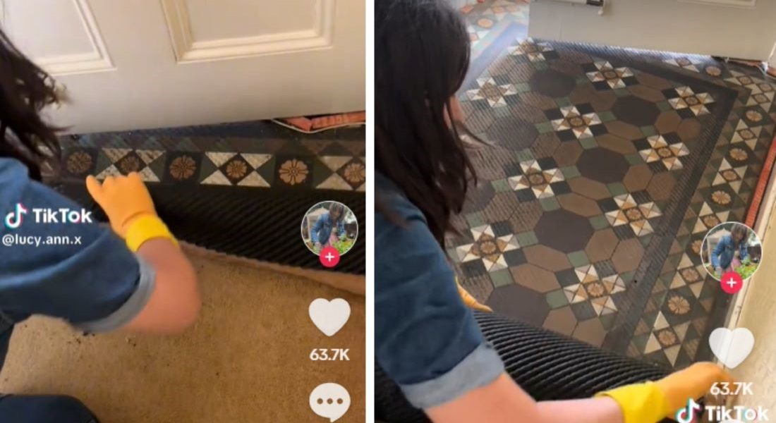 Люси Энн, пользовательница TikТоk, показала кадры ремонта 100-летнего семейного дома. После снятия старого ковра супруги неожиданно обнаружили под ним прекрасно сохранившуюся старинную плитку, что стало настоящим сюрпризом для новых владельцев.