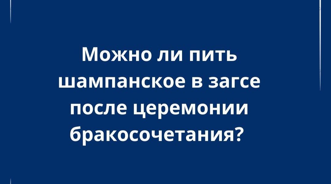 – Нет, нельзя. Запрещено распивать шампанское и другие алкогольные напитки как в самом помещении загса, так и на прилегающей к нему территории. Исключение — наличие в учреждении специального банкетного зала.