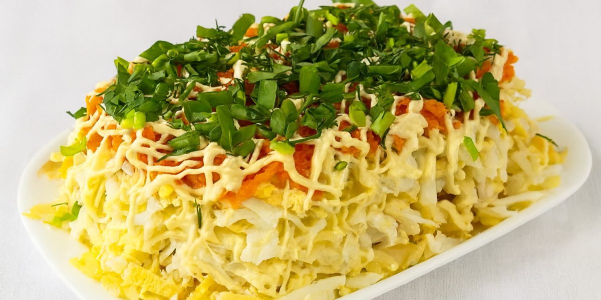 Далее — натёртые яйца, немного майонеза, затем морковь и финальный штрих — мелко нарезанная зелень.