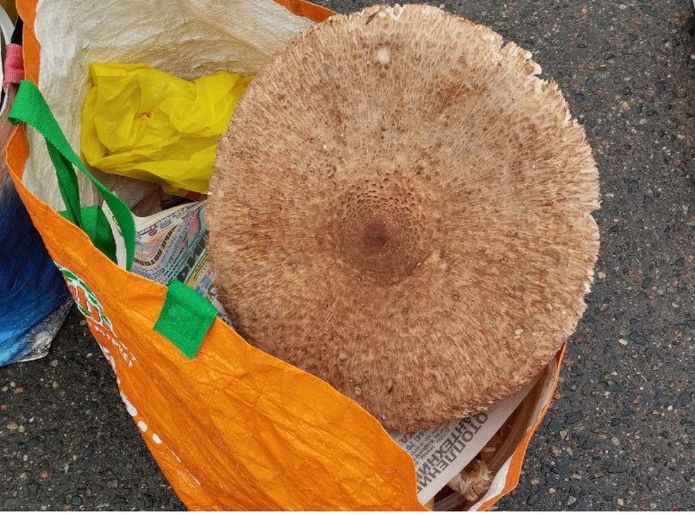 Один из продавцов показал гриб-зонтик таких размеров, что его трудно уместить даже на большую сковороду.