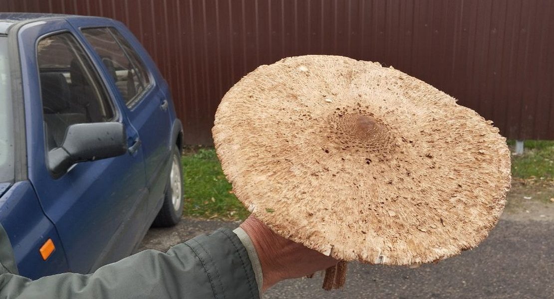 Один из продавцов показал гриб-зонтик таких размеров, что его трудно уместить даже на большую сковороду.